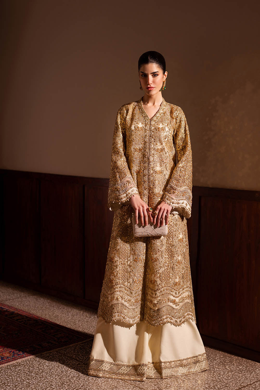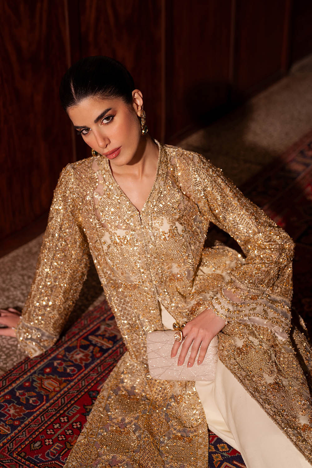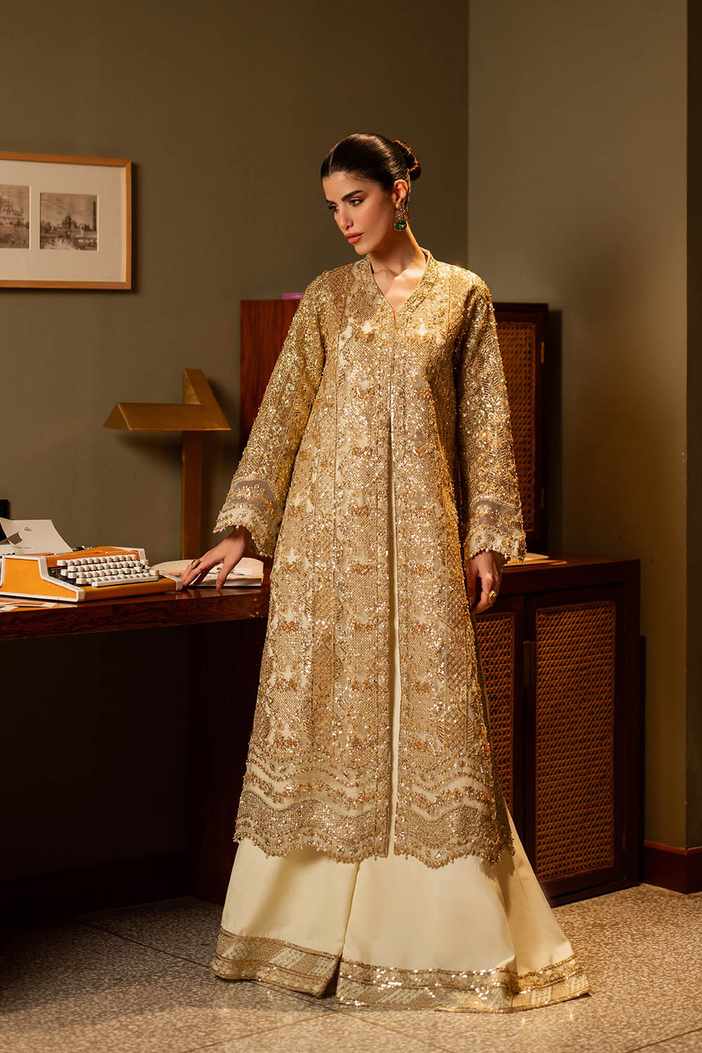 Emira is defined by elegance in its most effortless form. Rendered in a soft butter yellow, the long front-open organza shirt is detailed with a refined interplay of satin Swarovski, crystals, sequins, and pearl drops, offering a luminous yet composed finish. Paired with fluid rawsilk sharara pants and a tonal slip, the silhouette is graceful, light, and inherently sophisticated.