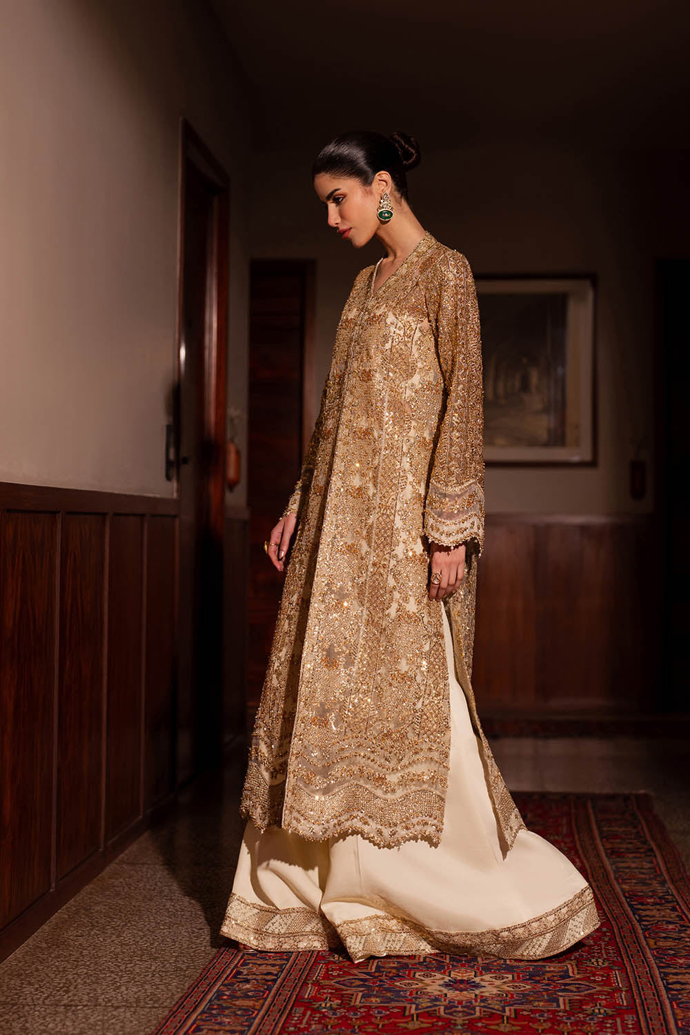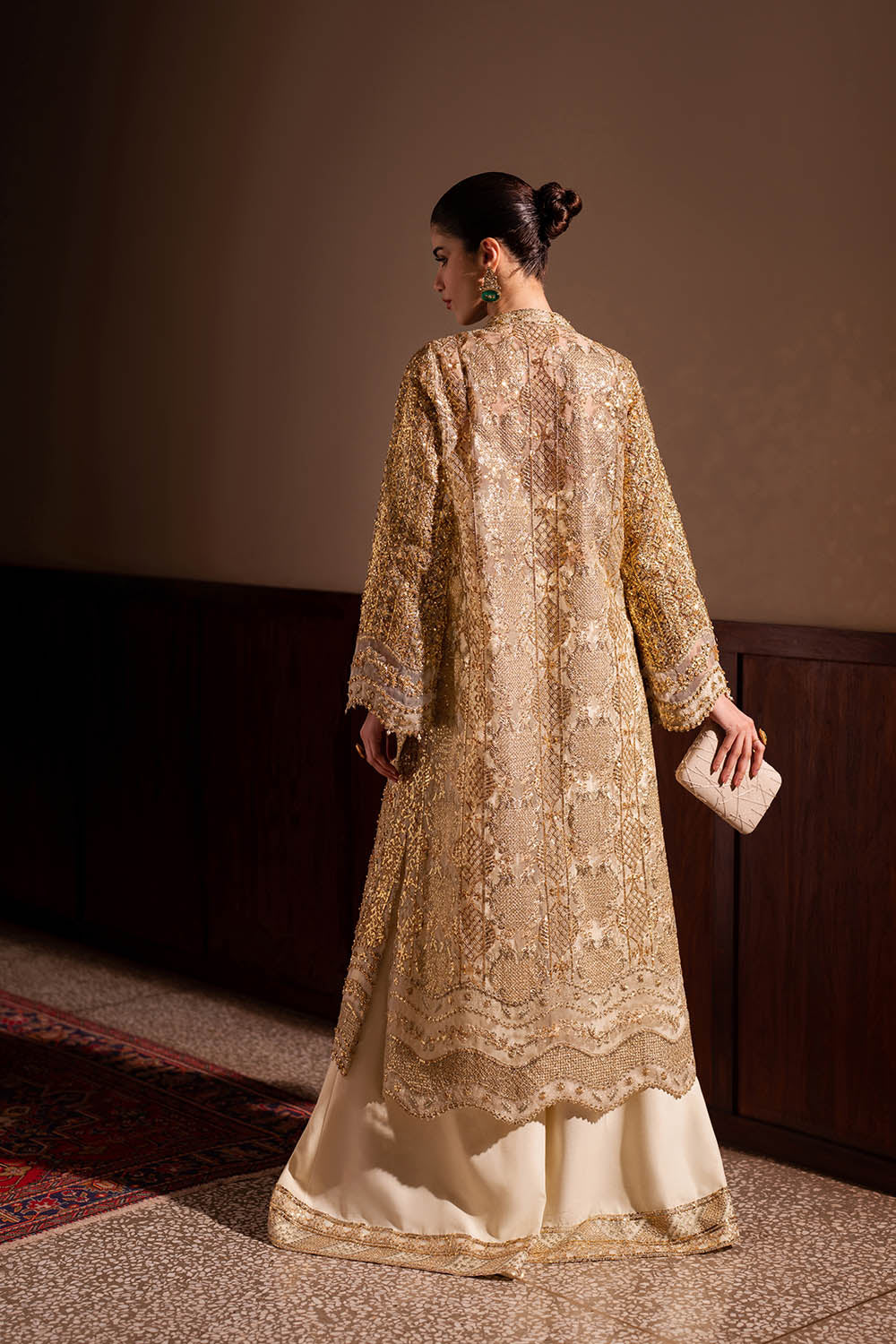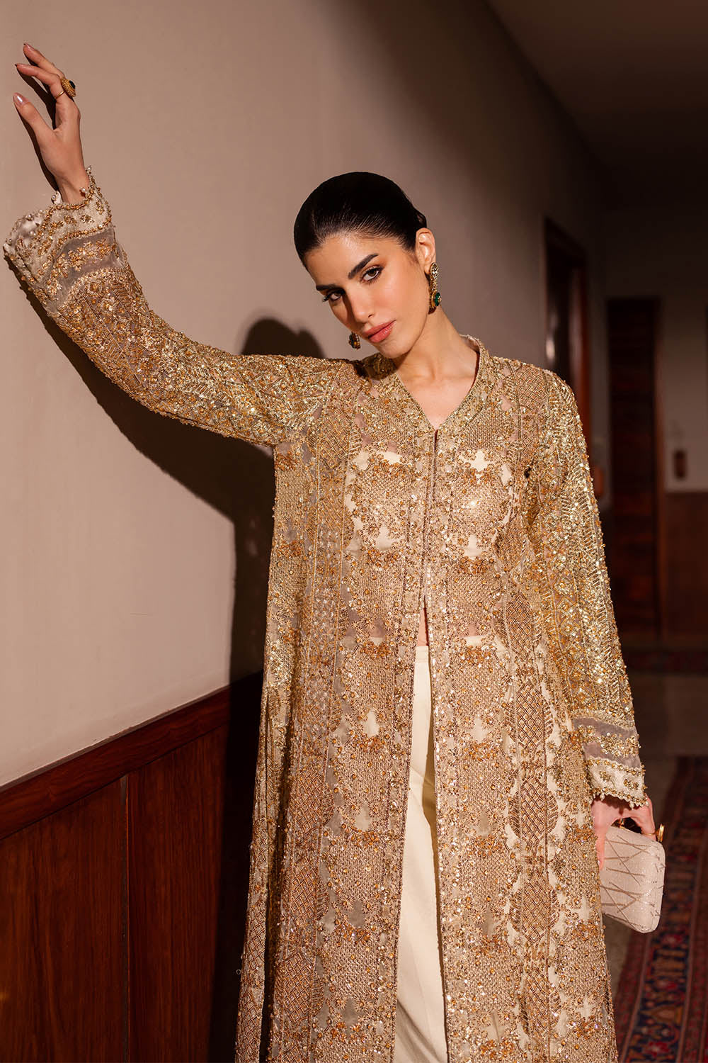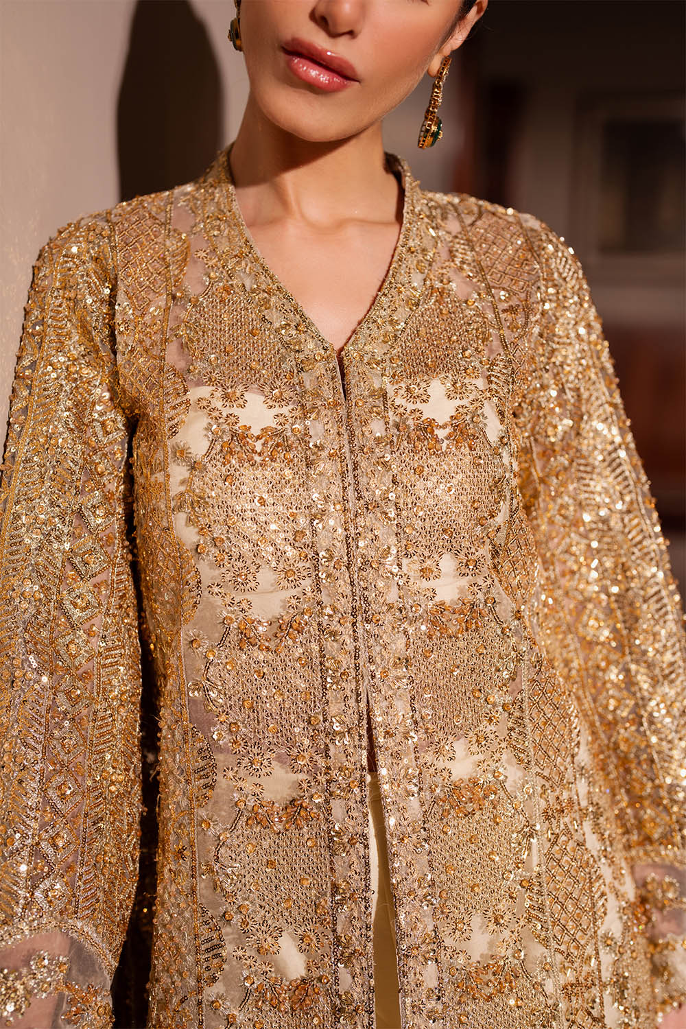 Emira is defined by elegance in its most effortless form. Rendered in a soft butter yellow, the long front-open organza shirt is detailed with a refined interplay of satin Swarovski, crystals, sequins, and pearl drops, offering a luminous yet composed finish. Paired with fluid rawsilk sharara pants and a tonal slip, the silhouette is graceful, light, and inherently sophisticated.