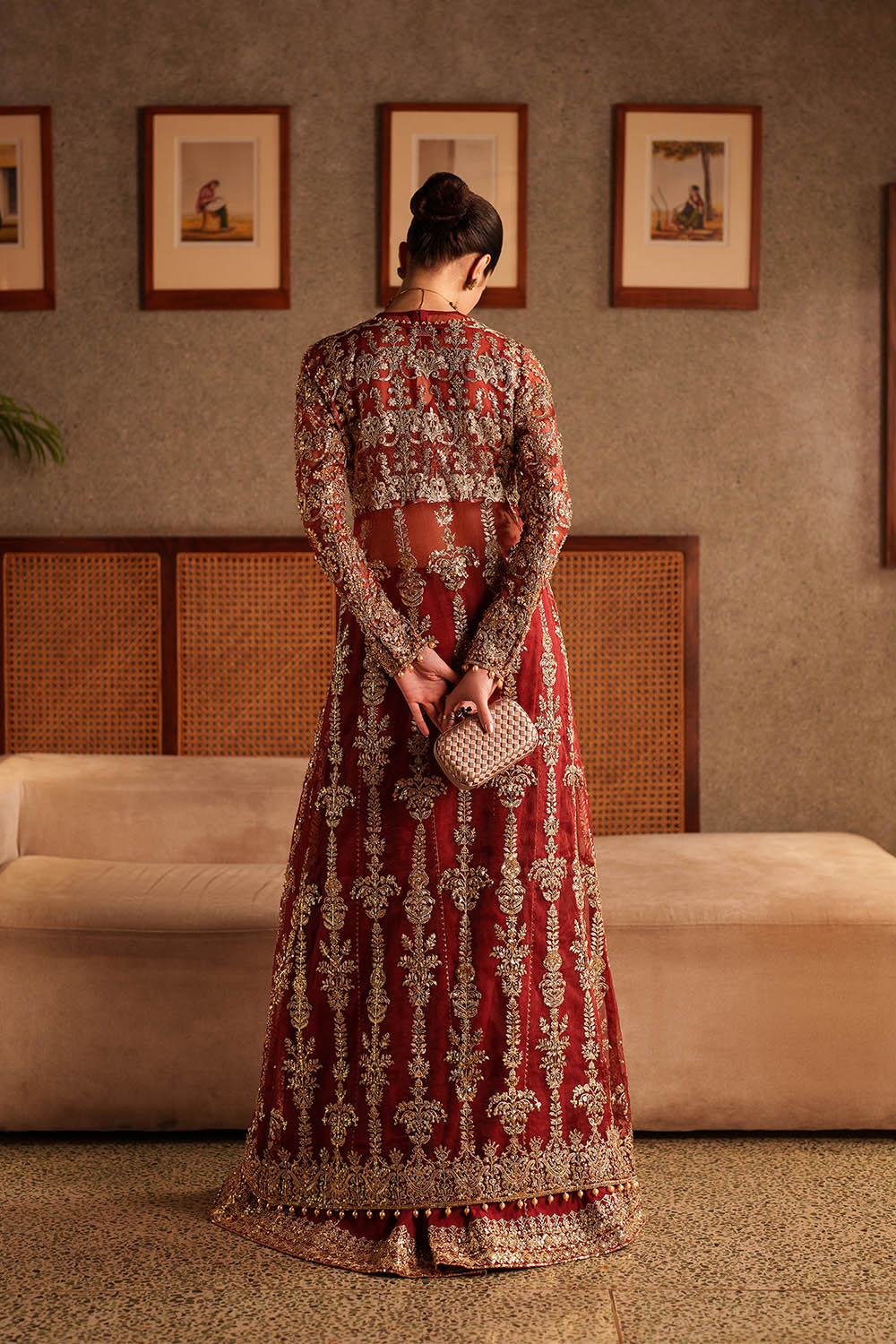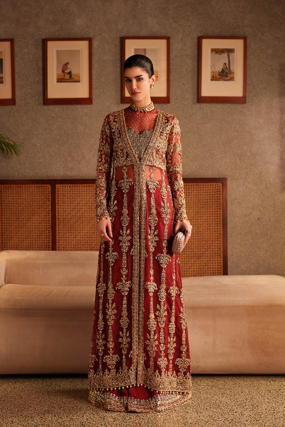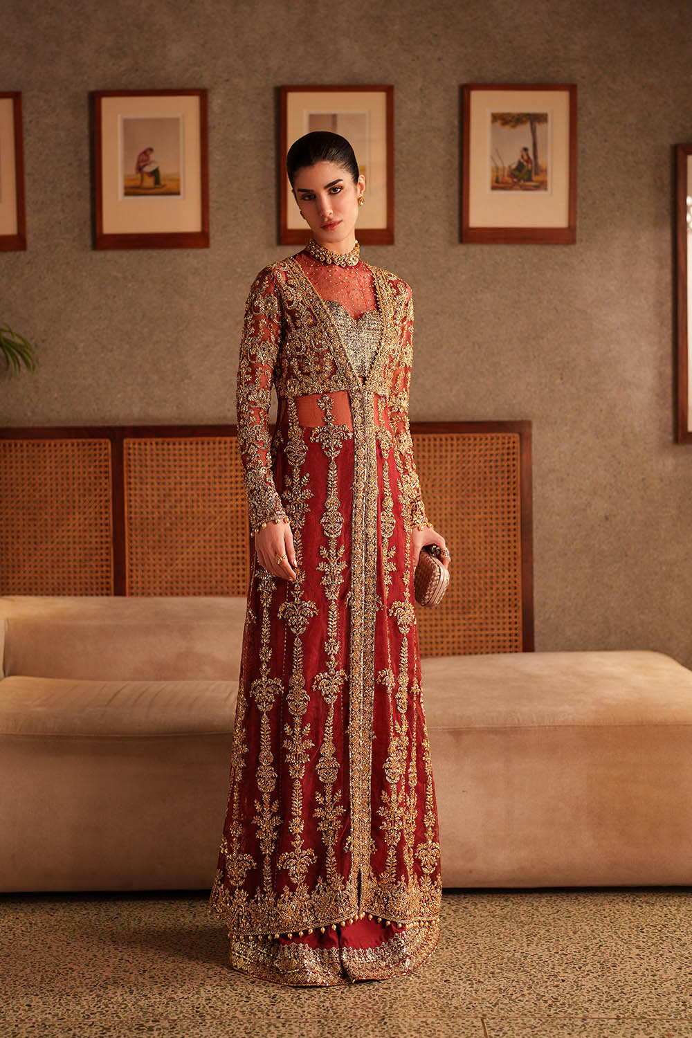 Lirien is a commanding ensemble in vibrant red, featuring a long front-open organza gown layered over a structured halter bustier. Satin Swarovski, crystals, sequins, pearl drops, and delicate embellishments are meticulously placed to enhance movement and catch light with subtle brilliance. Fluid rawsilk sharara pants complete the look, balancing structure with ease. Lightweight organza allows graceful drape across the gown and bustier, creating a silhouette that is modern, polished, and designed for formal occasions where presence and elegance converge.