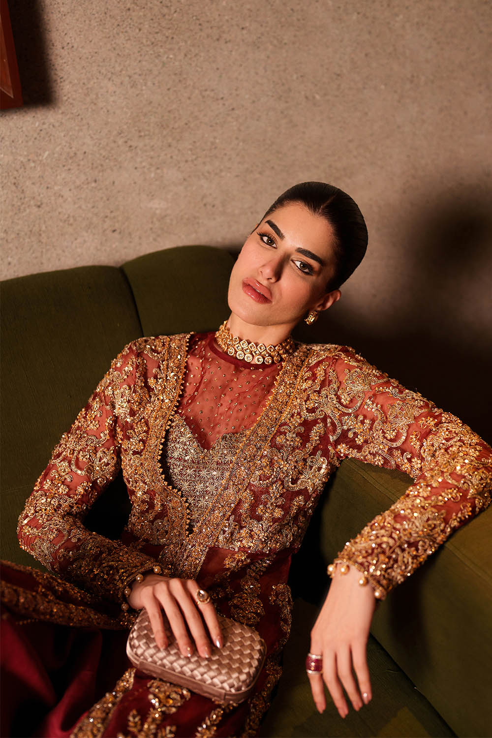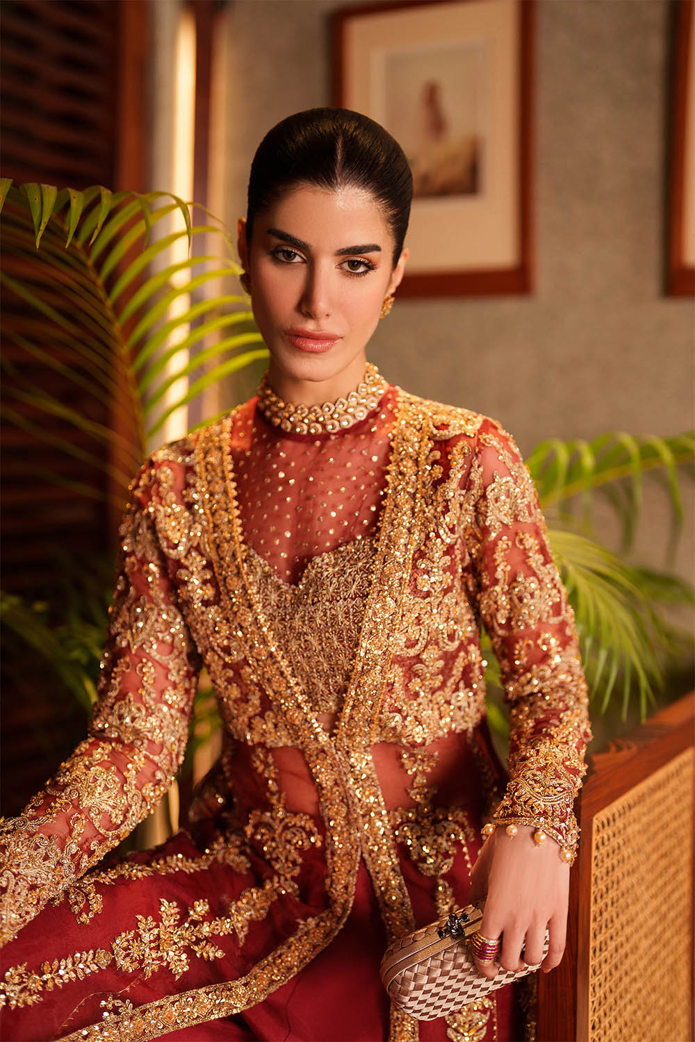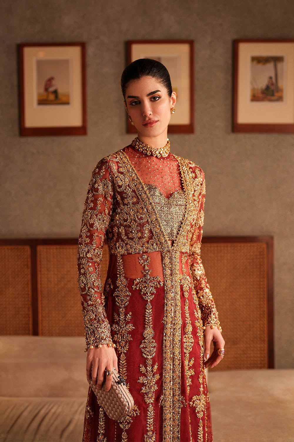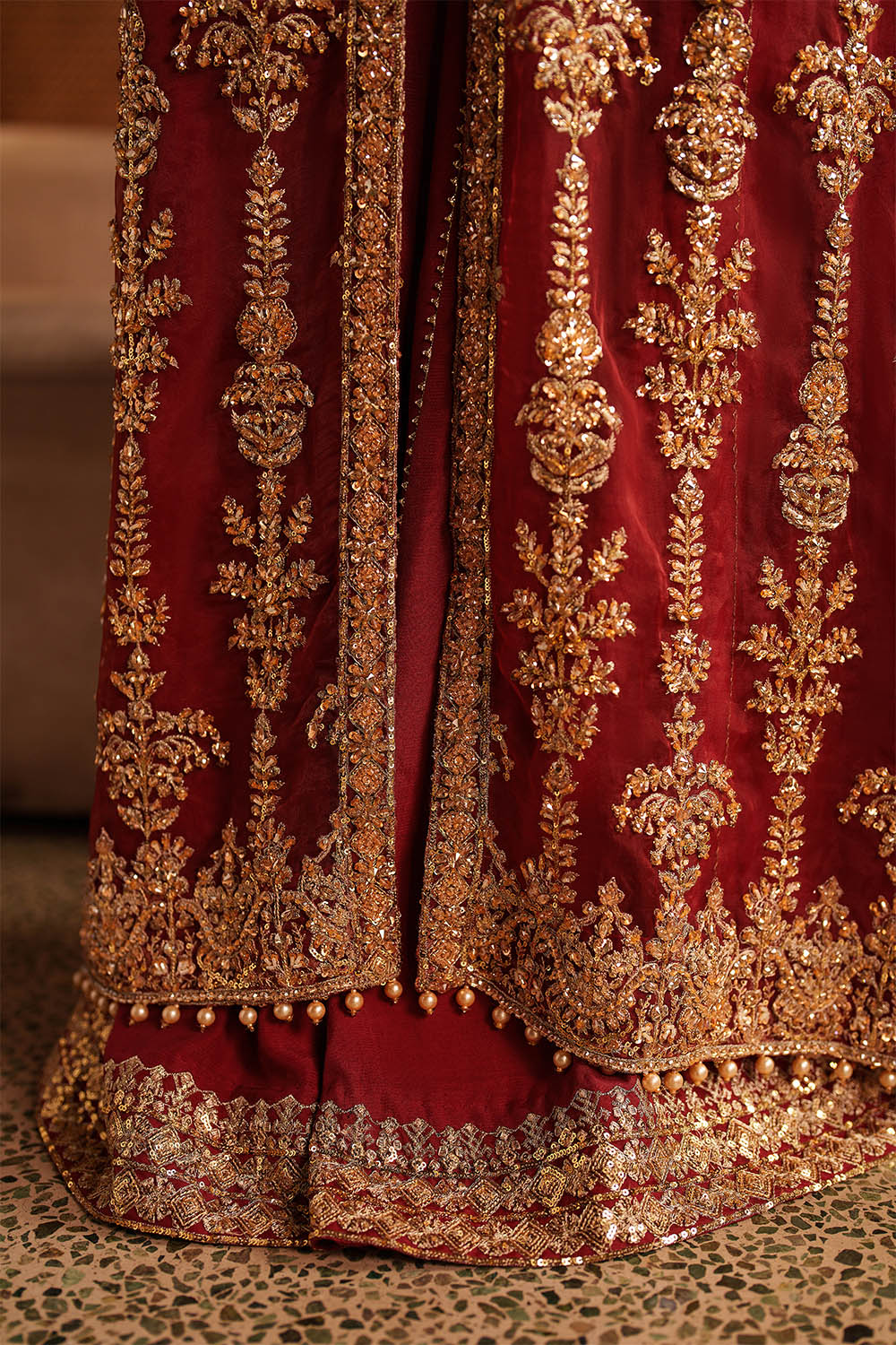 Lirien is a commanding ensemble in vibrant red, featuring a long front-open organza gown layered over a structured halter bustier. Satin Swarovski, crystals, sequins, pearl drops, and delicate embellishments are meticulously placed to enhance movement and catch light with subtle brilliance. Fluid rawsilk sharara pants complete the look, balancing structure with ease. Lightweight organza allows graceful drape across the gown and bustier, creating a silhouette that is modern, polished, and designed for formal occasions where presence and elegance converge.