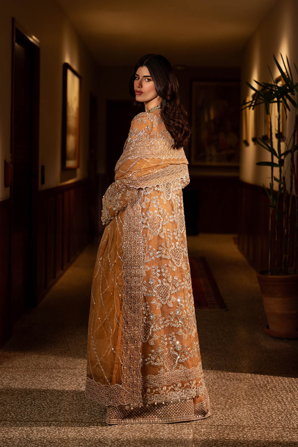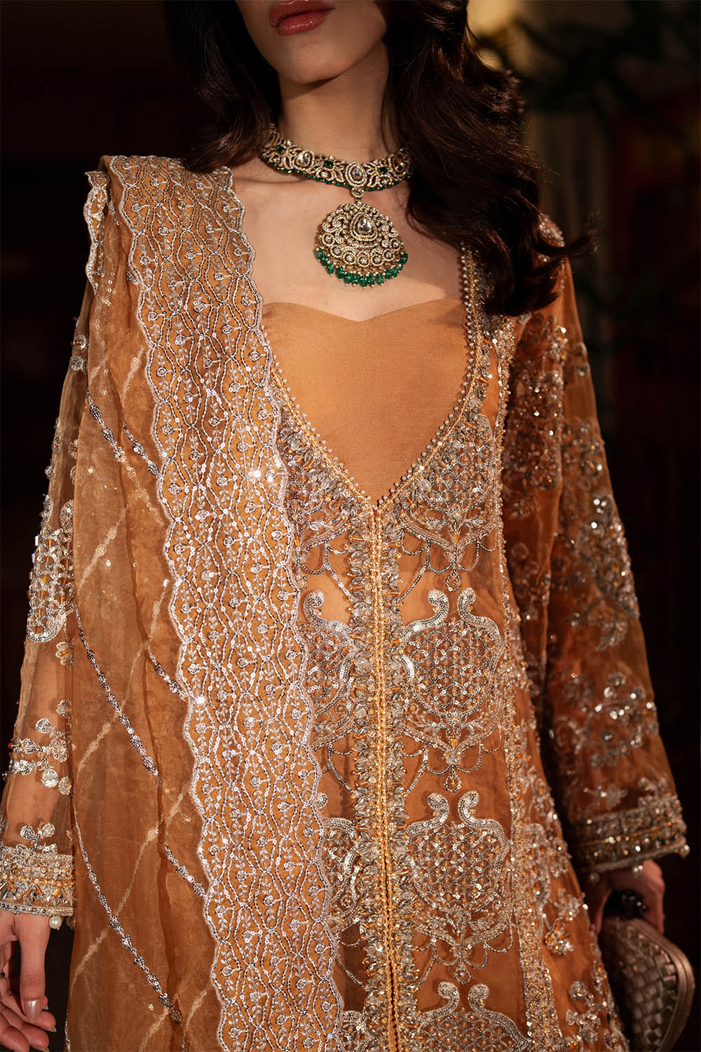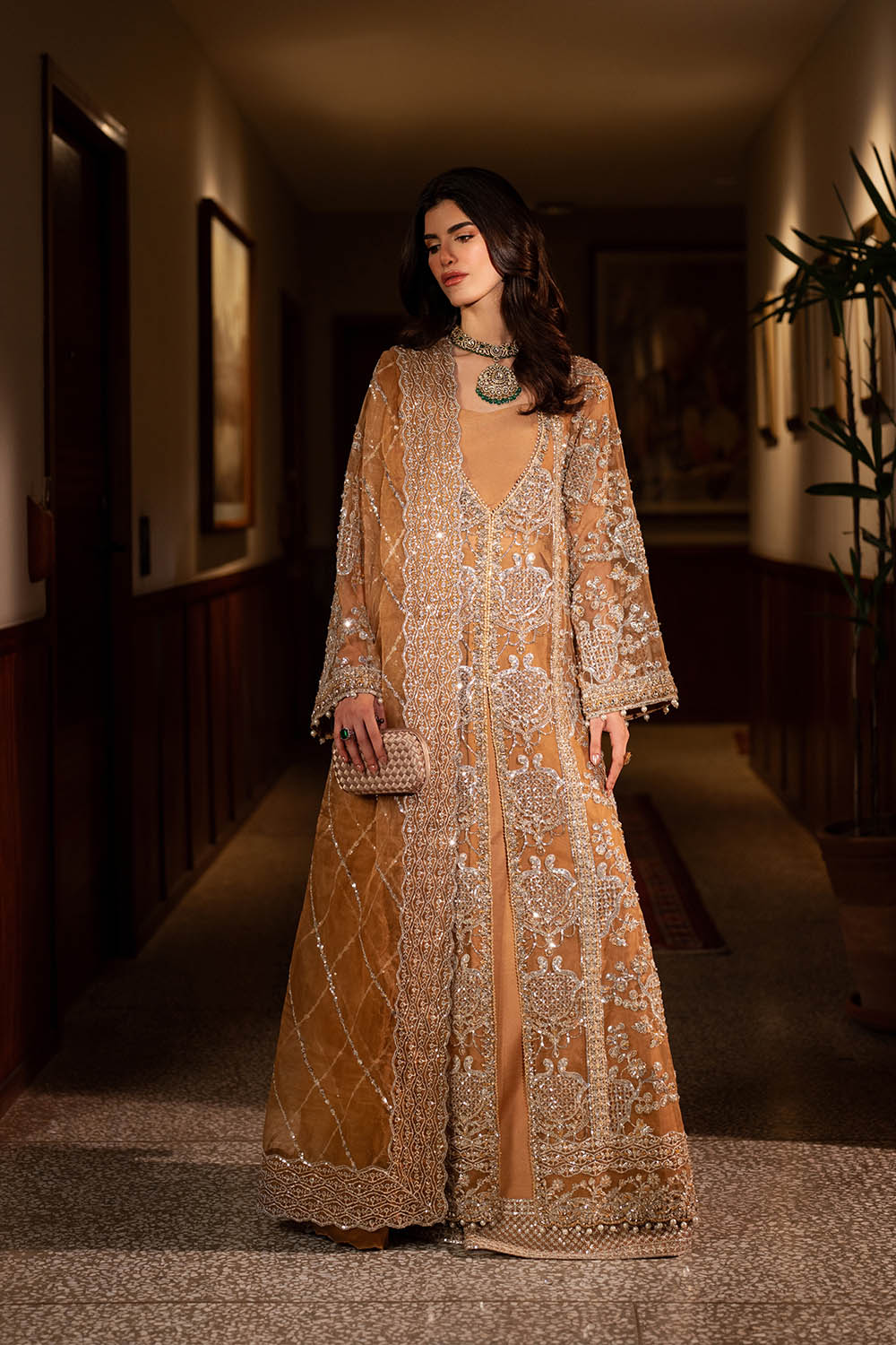 Livia is a long front-open organza gown in rich mocha, paired with rawsilk sharara pants and a coordinating organza dupatta. Swarovski crystals, sequins, beads, and pearl drops are arranged with precision, creating subtle shimmer and movement across the silhouette. The interplay of structured gown panels and fluid sharara pants produces a modern, refined form—designed for formal occasions where elegance, presence, and contemporary sophistication converge.