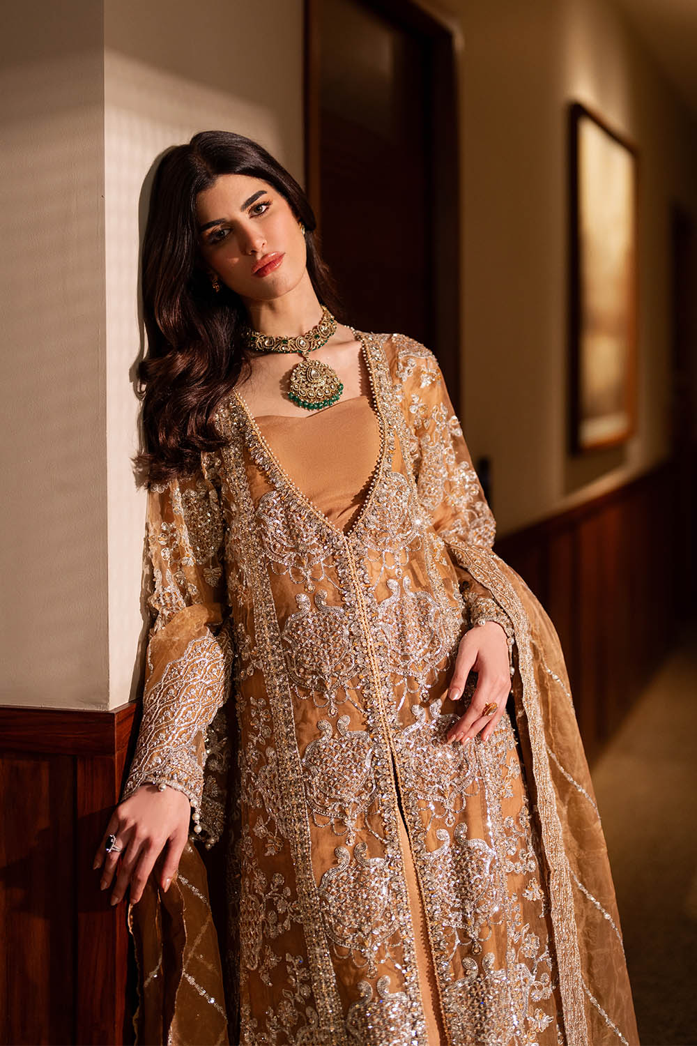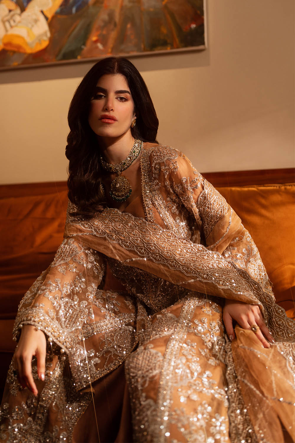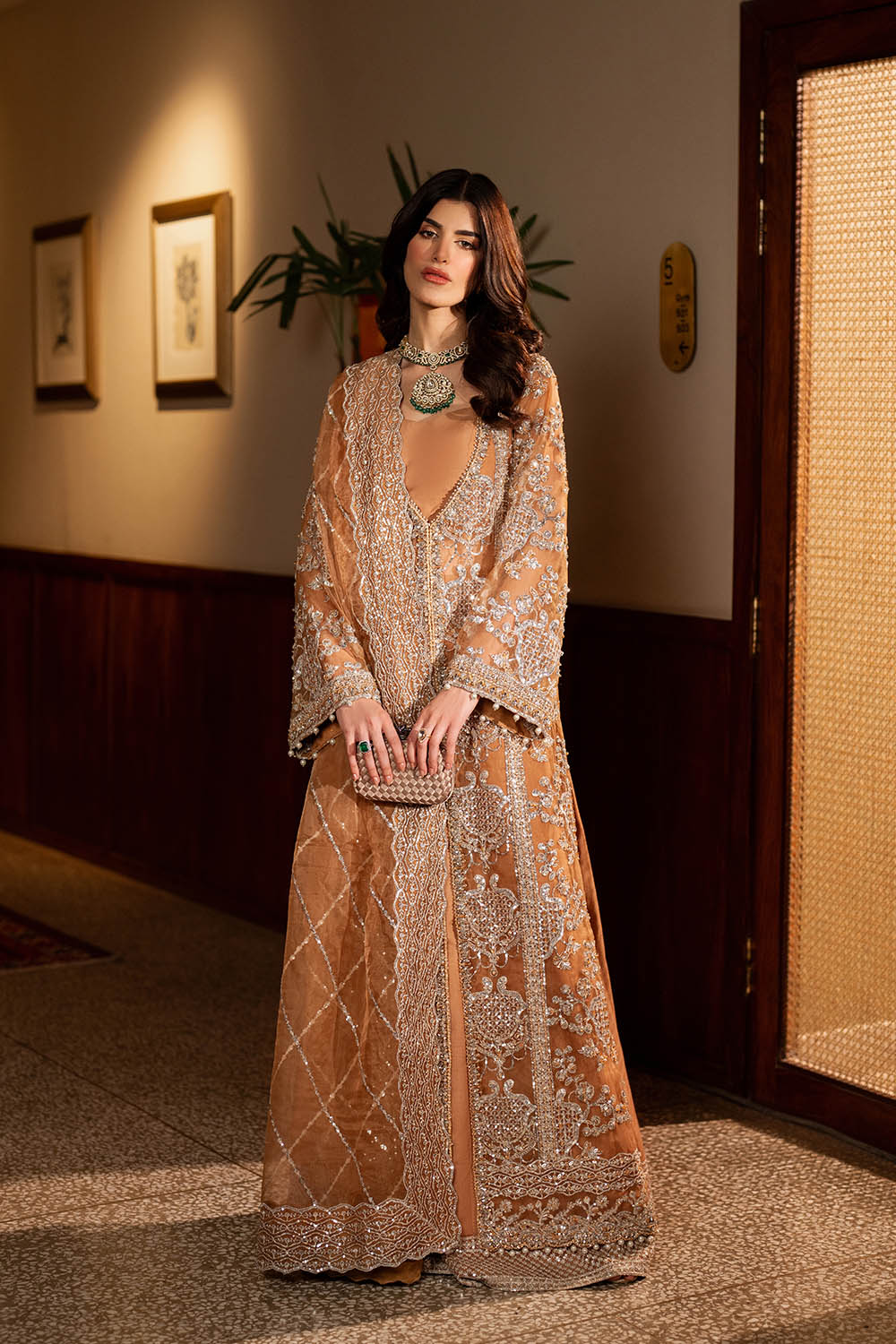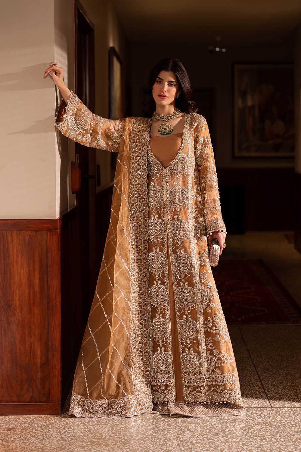 Livia is a long front-open organza gown in rich mocha, paired with rawsilk sharara pants and a coordinating organza dupatta. Swarovski crystals, sequins, beads, and pearl drops are arranged with precision, creating subtle shimmer and movement across the silhouette. The interplay of structured gown panels and fluid sharara pants produces a modern, refined form—designed for formal occasions where elegance, presence, and contemporary sophistication converge.