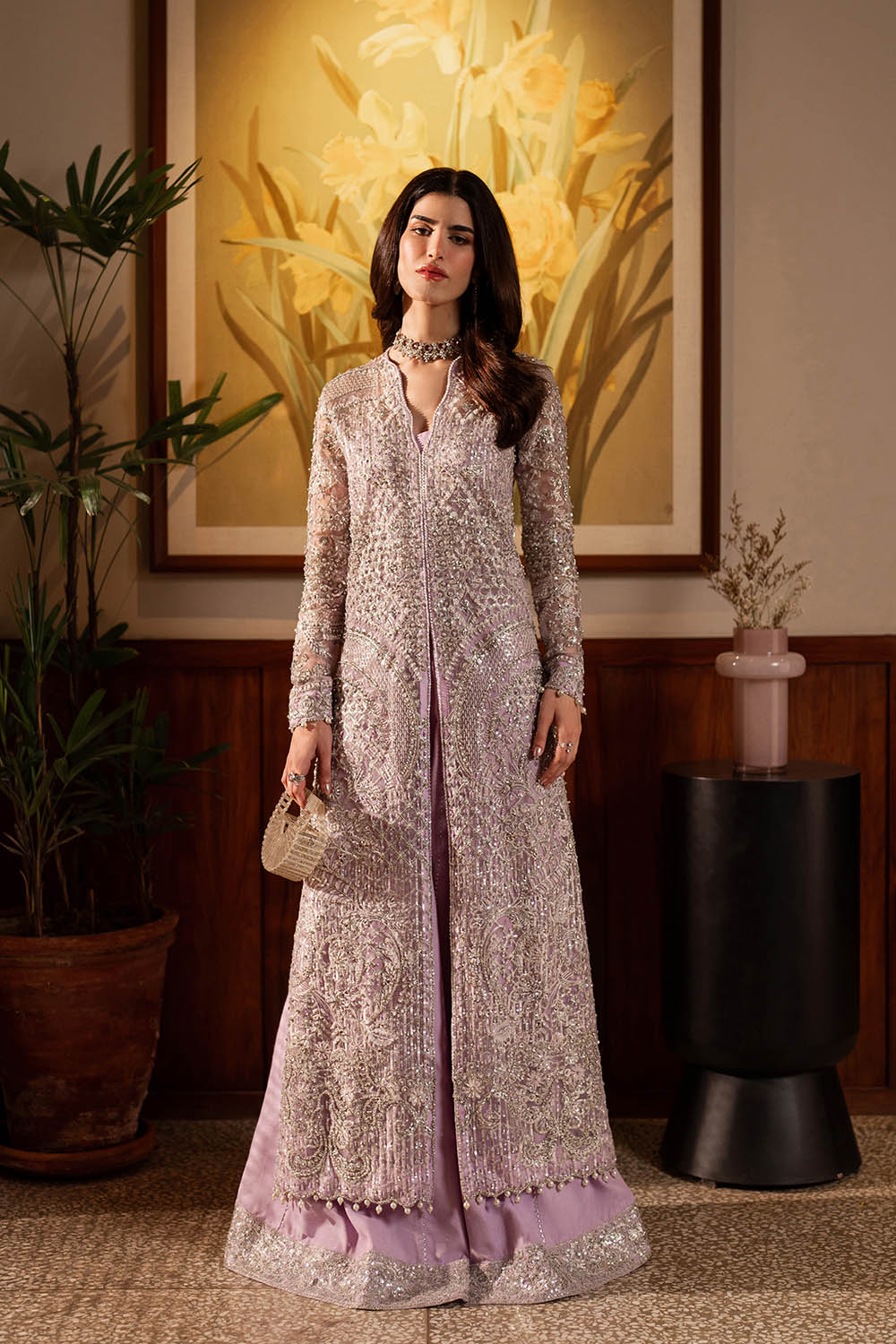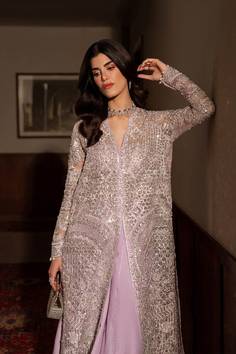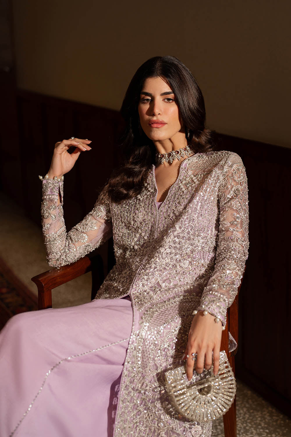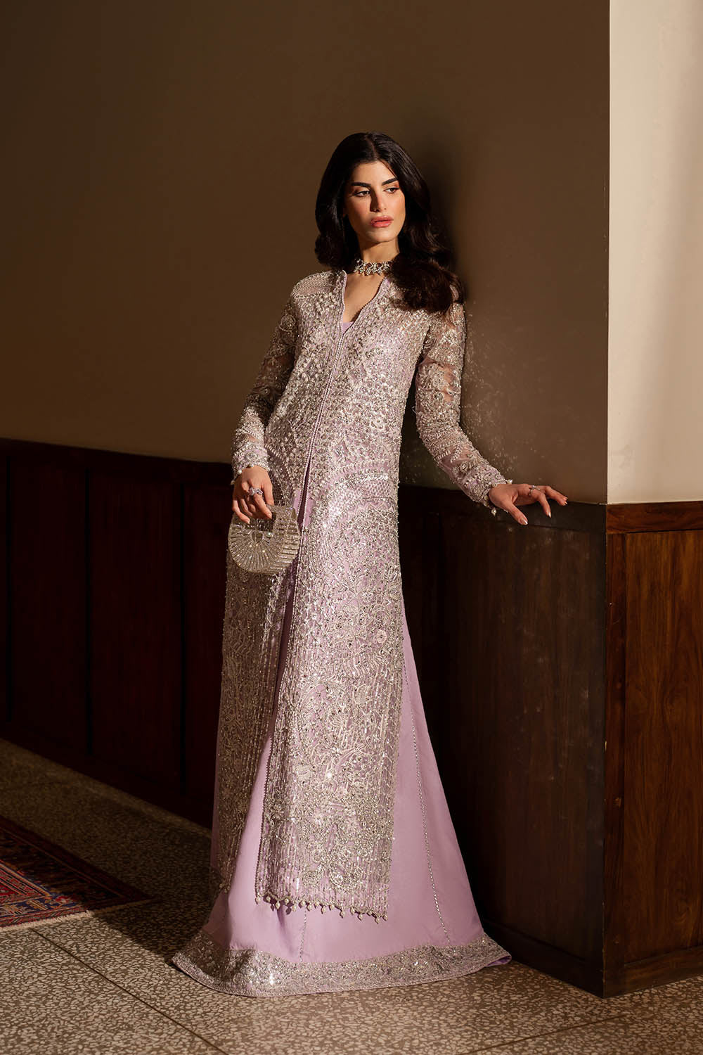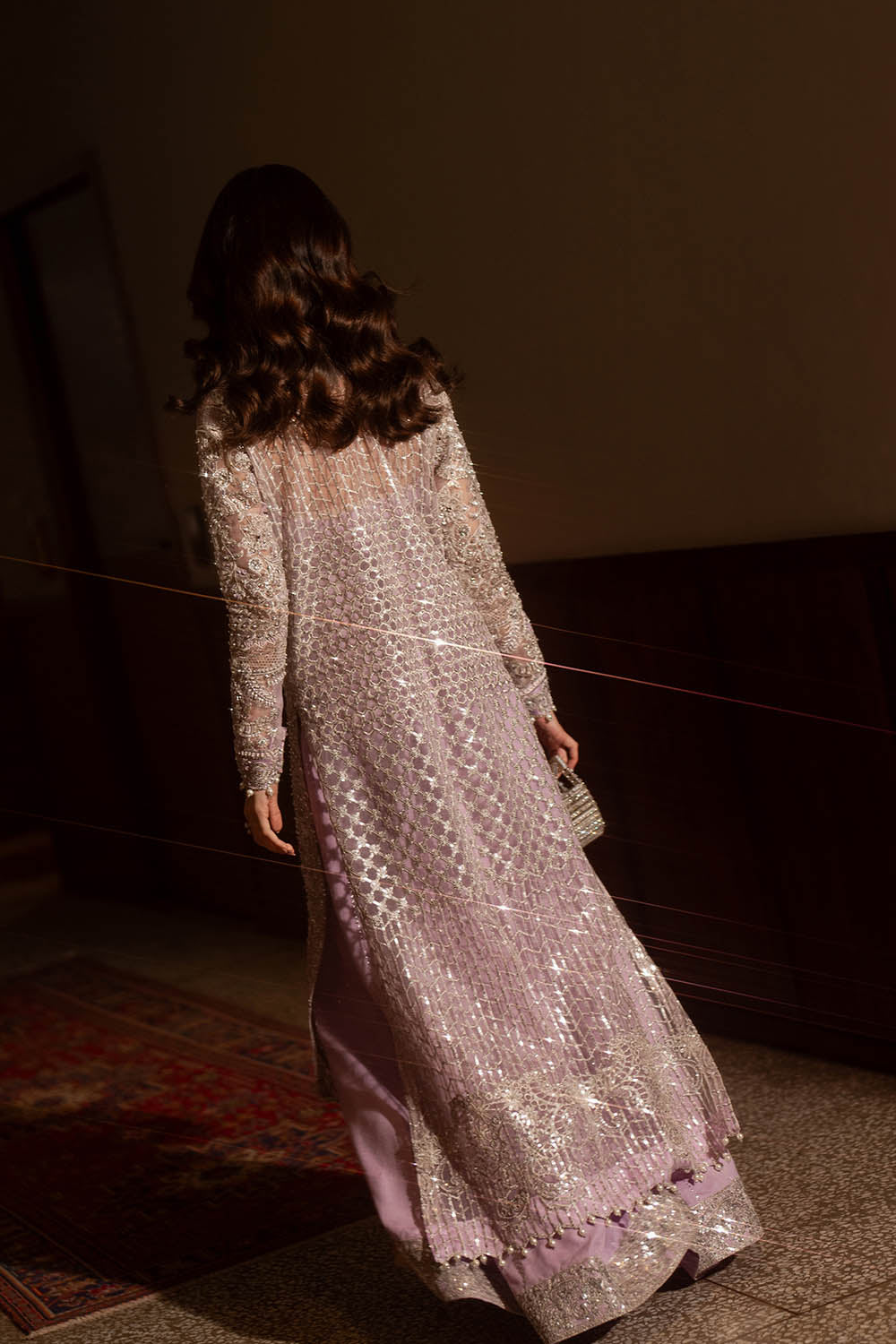 Nyah features a long front-open organza gown in lilac, paired with flowing rawsilk sharara pants. Swarovski crystals, sequins, pearl drops, and precise embellishments catch the light with deliberate brilliance, enhancing the movement of the silhouette. The combination of structured panels and fluid trousers creates a modern, elevated form—designed for formal occasions where elegance and presence are paramount.