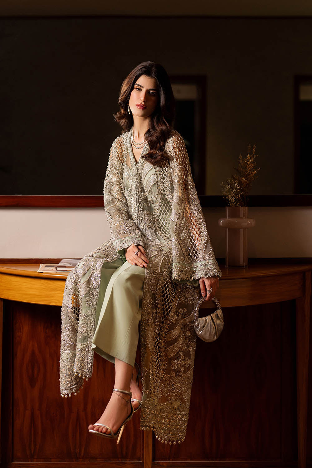A long front-open organza gown in luminous light ferozi, Raya is detailed with silver Swarovski, crystals, sequins, and pearl drops, strategically placed for refined shimmer and movement. The structured yet fluid panels are paired with rawsilk culottes and a tonal slip, balancing volume with precision. Lightweight organza allows graceful drape, while rawsilk provides subtle structure, creating a silhouette that is polished, contemporary, and designed for formal occasions where elegance meets statement dressing.