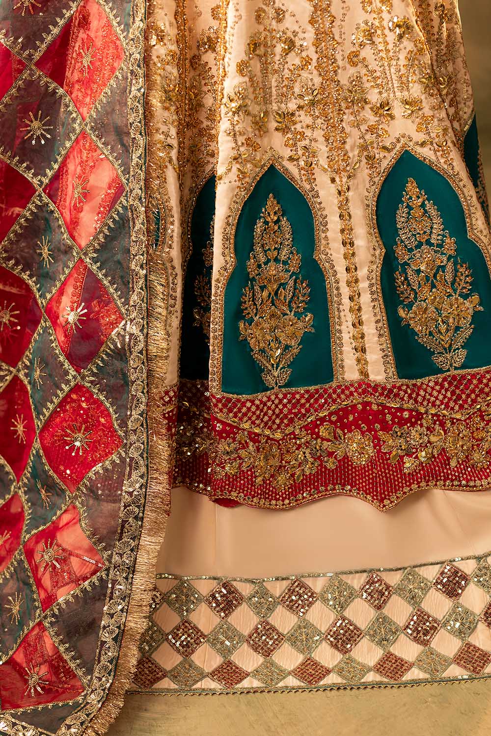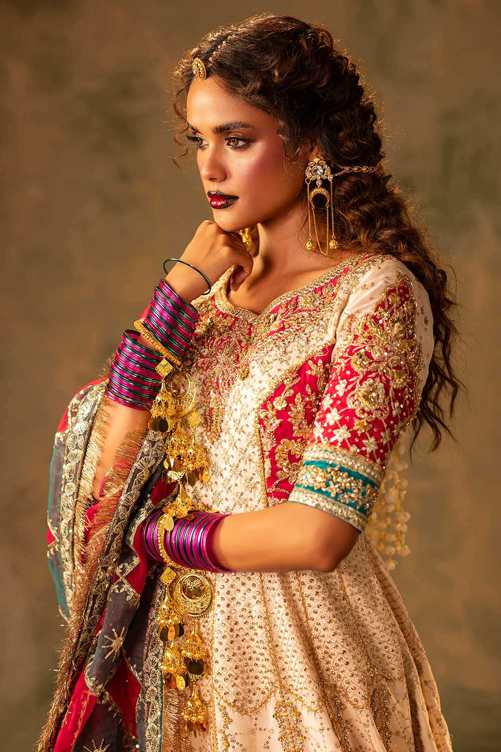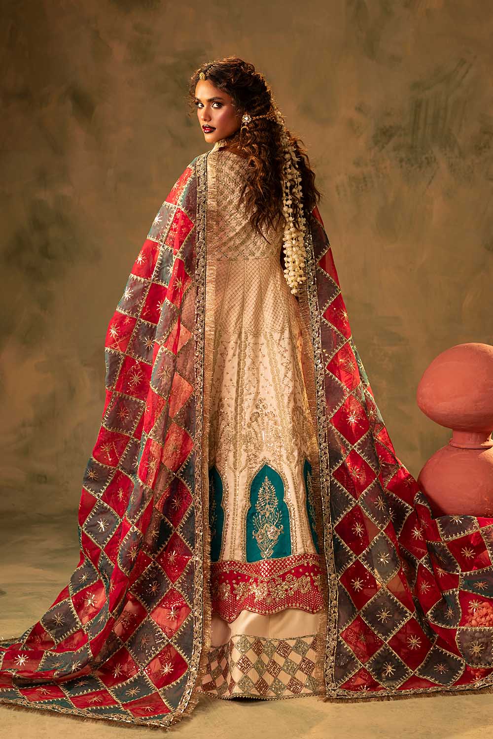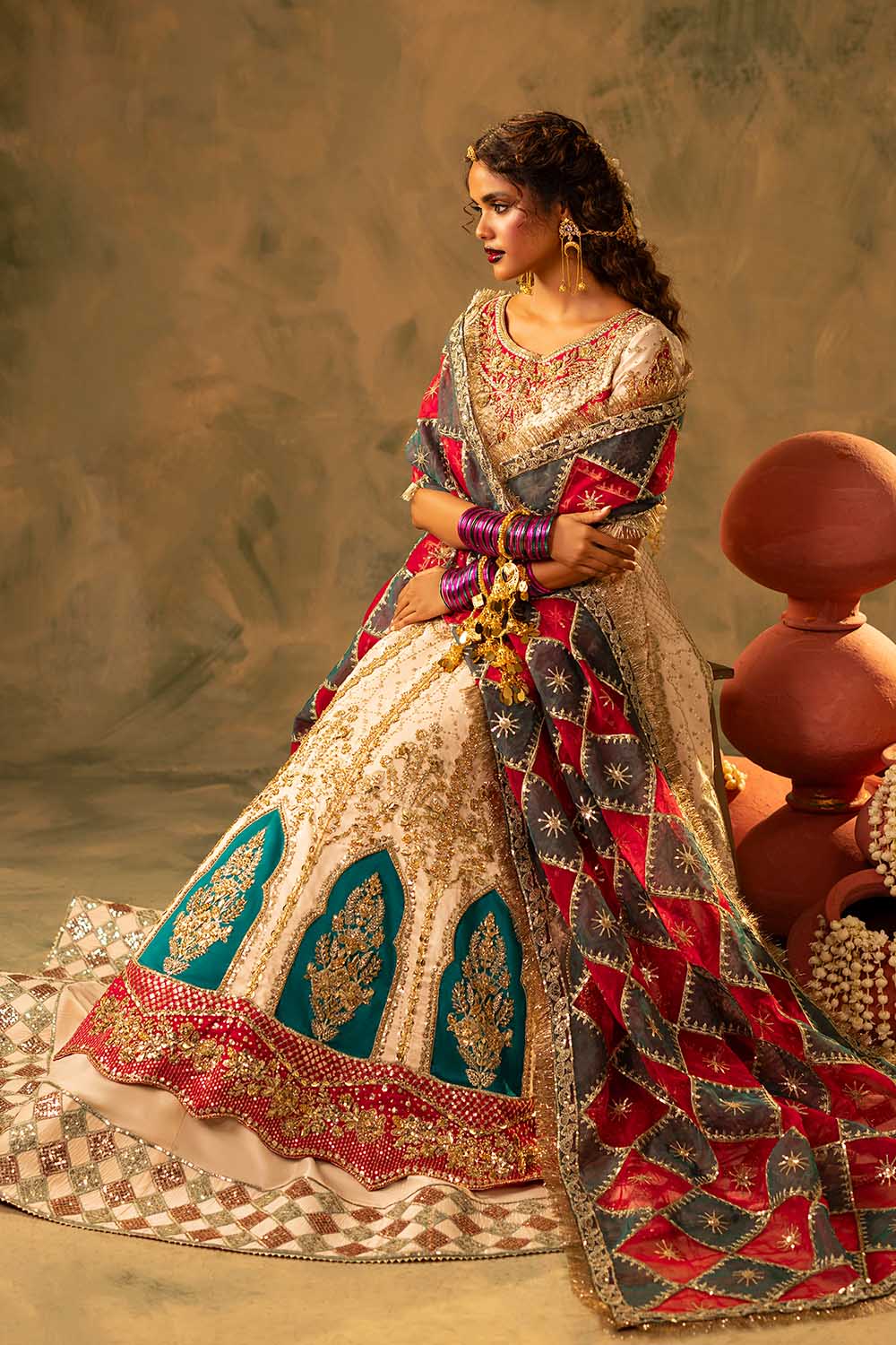 Abroo is a regal Pishwas crafted from luxurious raw silk, adorned with intricate handwork of Naqshi, Dabka, Gota, Crystals, and Sequins. The detailed craftsmanship is elevated with modern colored patchwork, adding a vibrant and contemporary touch to its traditional silhouette. Paired with a beautifully embroidered lehnga featuring exquisite hand embellishments, the ensemble embodies elegance and grandeur. The look is completed with a multicolored dupatta, perfectly complementing the outfit while enhancing its festive charm. Abroo is an ideal choice for brides and festive occasions, making a timeless statement of tradition blended with modern artistry.