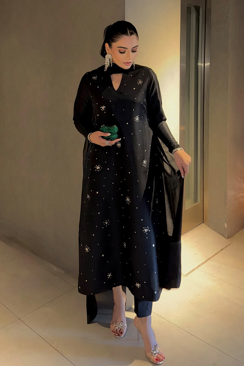 This refined ensemble features a long A-line shirt tailored from luxurious tissue Korean silk, offering an airy yet structured silhouette that exudes understated opulence. Paired with sleek cigarette pants crafted in matching tissue Korean silk, the look is elevated through its clean lines and contemporary finesse. The design is lavishly adorned with hand-applied satin Swarovski elements, shimmering crystals, and delicate sequins that catch the light with every movement, adding a subtle couture sparkle. Completing the ensemble is an ethereal georgette chiffon dupatta, draping effortlessly to lend softness and contrast, resulting in a harmonious blend of modern elegance and timeless designer sophistication.
