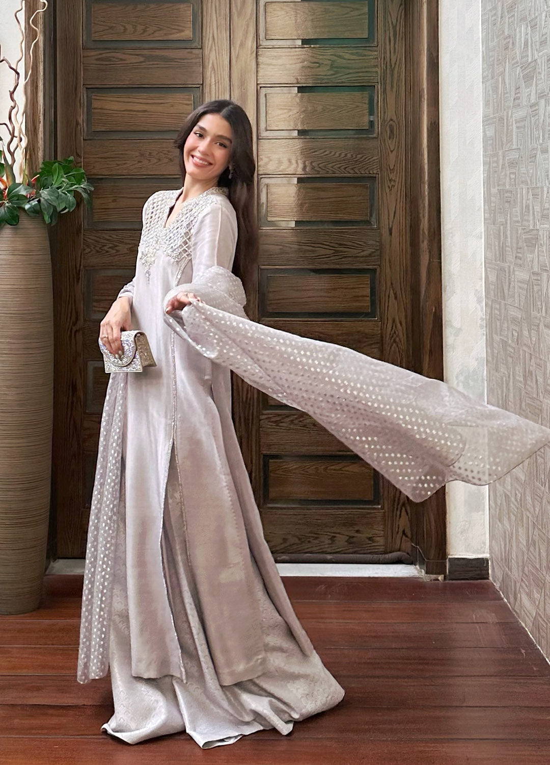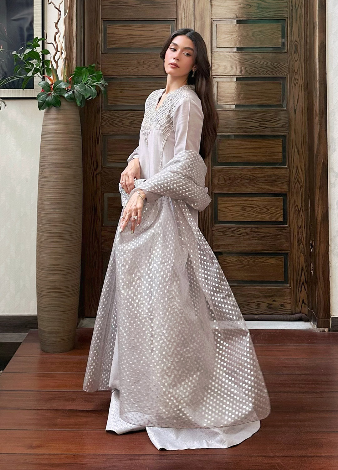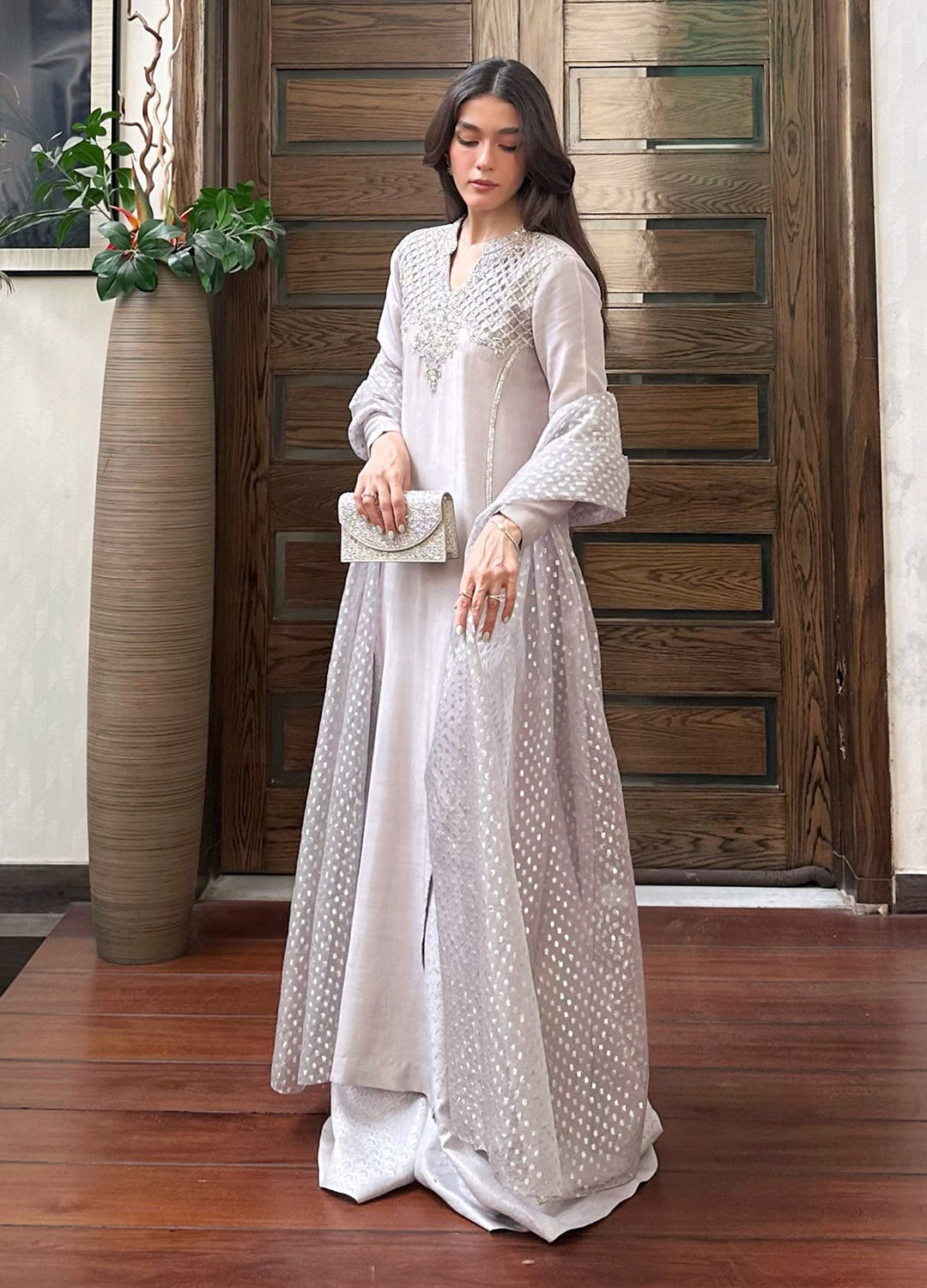 Chic and contemporary, this steel grey long gown-style shirt is a perfect blend of elegance and modern design. The neckline features exquisite cutwork that adds a refined, fashion-forward touch. Paired with matching trousers and a delicate organza dupatta, this ensemble offers effortless sophistication—ideal for formal events, evening soirées, or festive celebrations.
