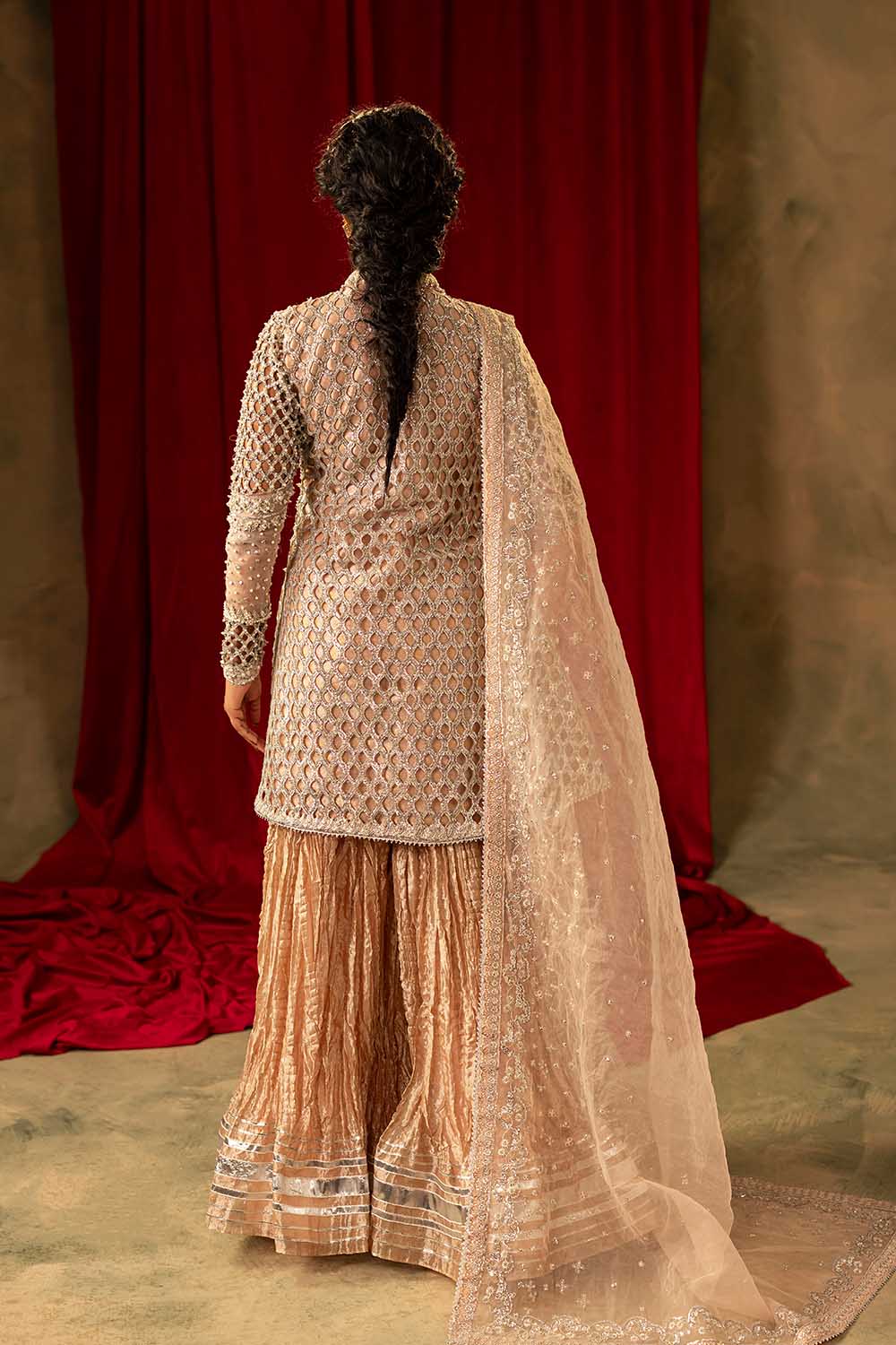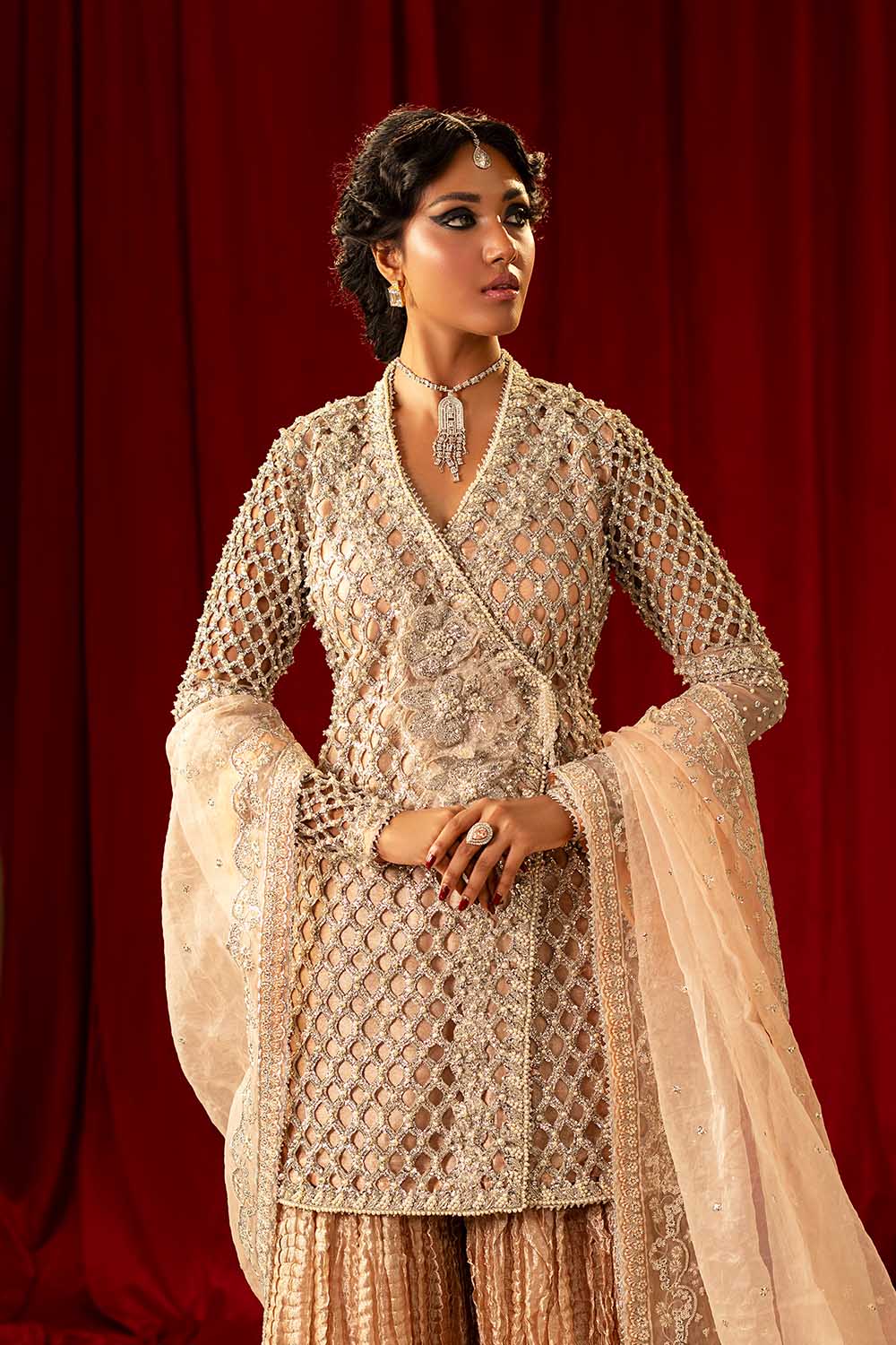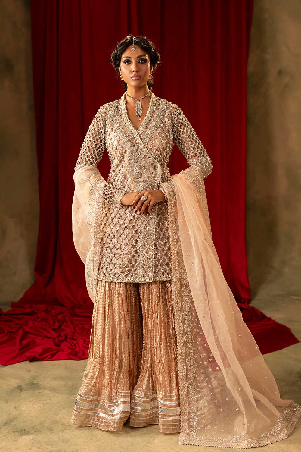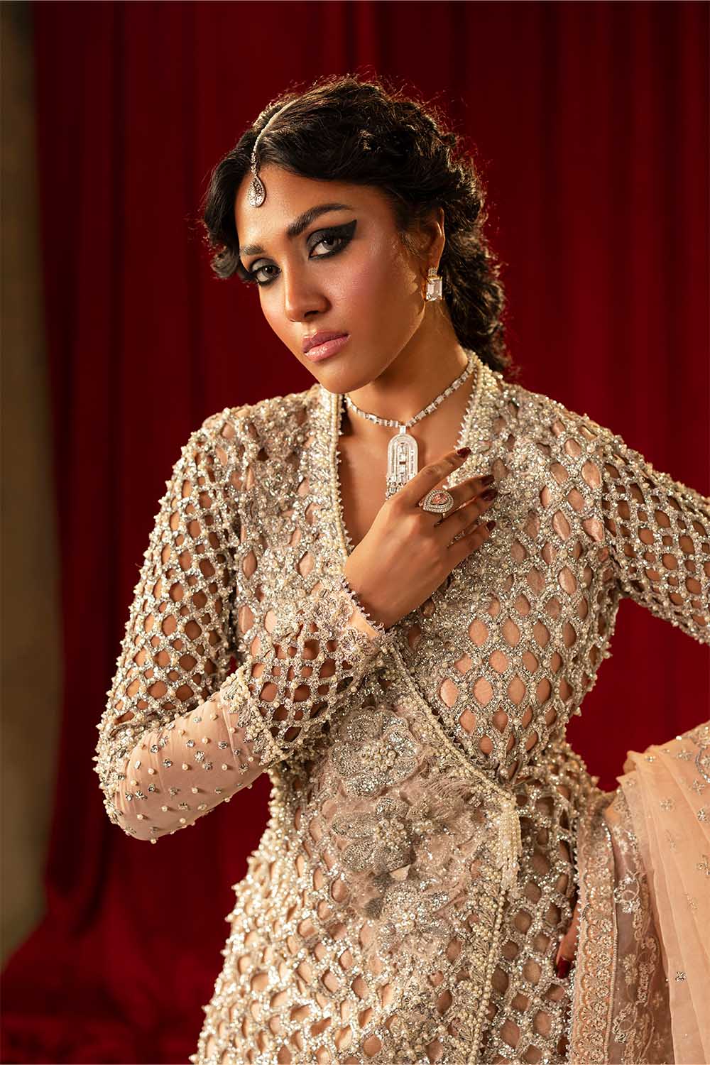 Experience the legendary glamour of 'Kohinoor,' a regal ensemble that pairs a stylized Short Angrakha crafted from luminous Organza with an exquisitely draped Crushed Sharara made from shimmering Tissue fabric. The Angrakha is completely enveloped in a gorgeous Jaal effect (all-over lattice) of fine embroidery, featuring a dazzling array of hand work, dimensional Naqshi, sharp-edged Cutdana, iridescent Pearls, brilliant Crystals, and sparkling Sequins. This combination of structural artistry and intense shimmer, rich with multi-textured embellishments, creates a dramatic, voluminous silhouette, making 'Kohinoor' a truly unforgettable choice for any grand occasion.