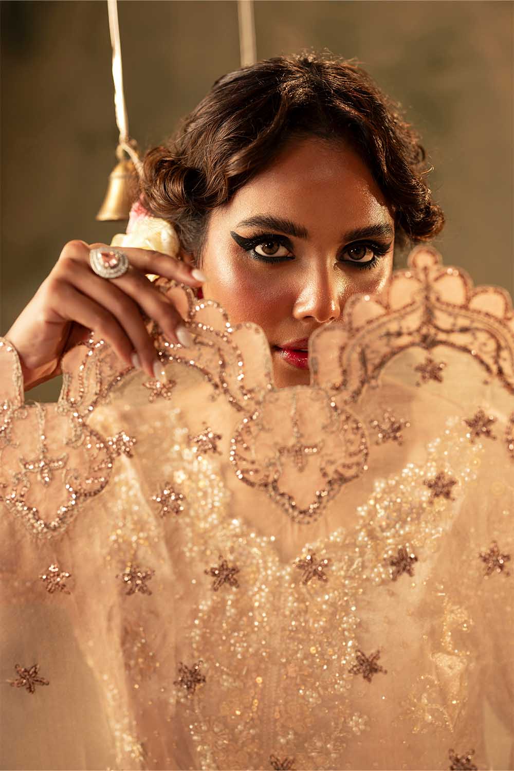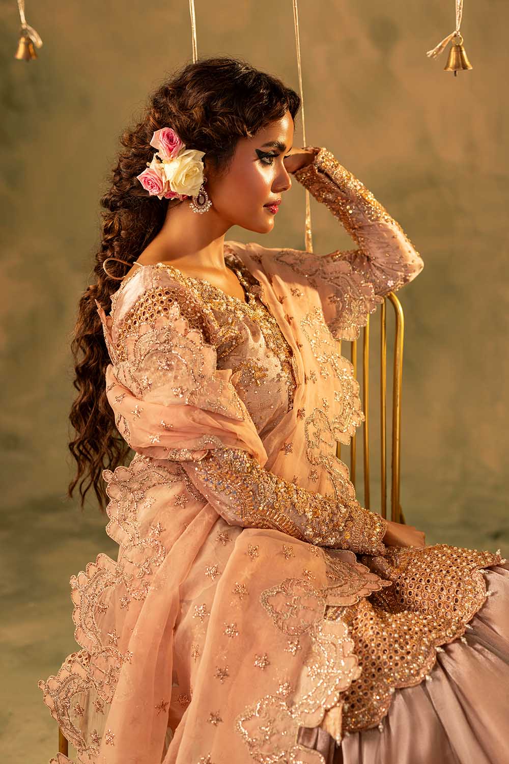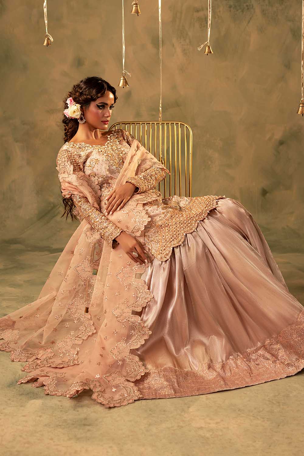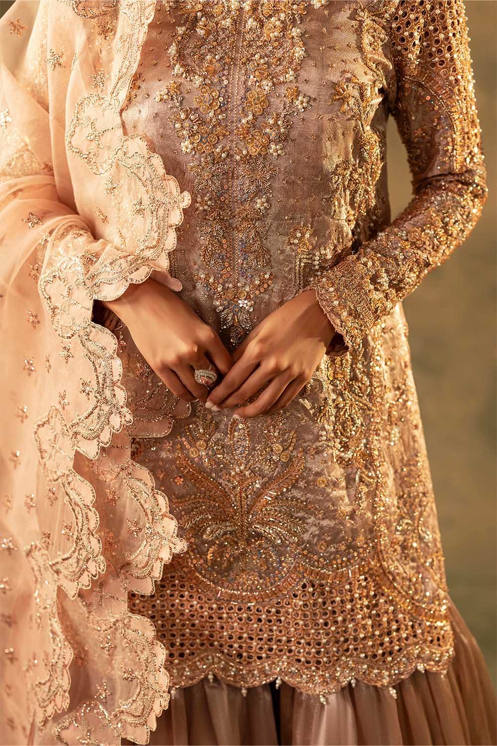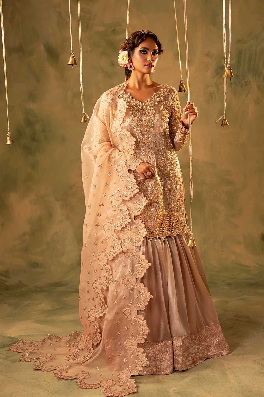 Nazam is a masterpiece of elegance, crafted on luxurious tissue fabric. The short shirt is adorned with exquisite hand embellishments of pearls, Sequins, Crystals, Naqshi, Dabka, and Gota, creating a radiant golden glow. Paired with a graceful Gharara in lustrous fabric, it adds volume and a regal flair to the silhouette. A delicately embroidered dupatta, finished with scalloped borders and hand-detailed accents, completes the look with finesse. Perfect for engagements, festive soirées, or wedding celebrations, Nazam beautifully blends timeless tradition with modern sophistication.