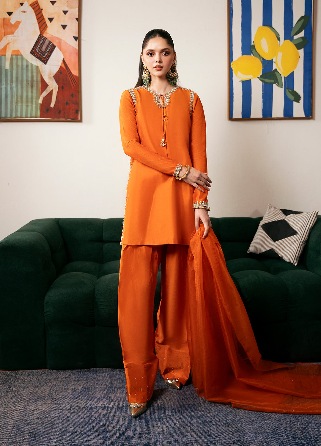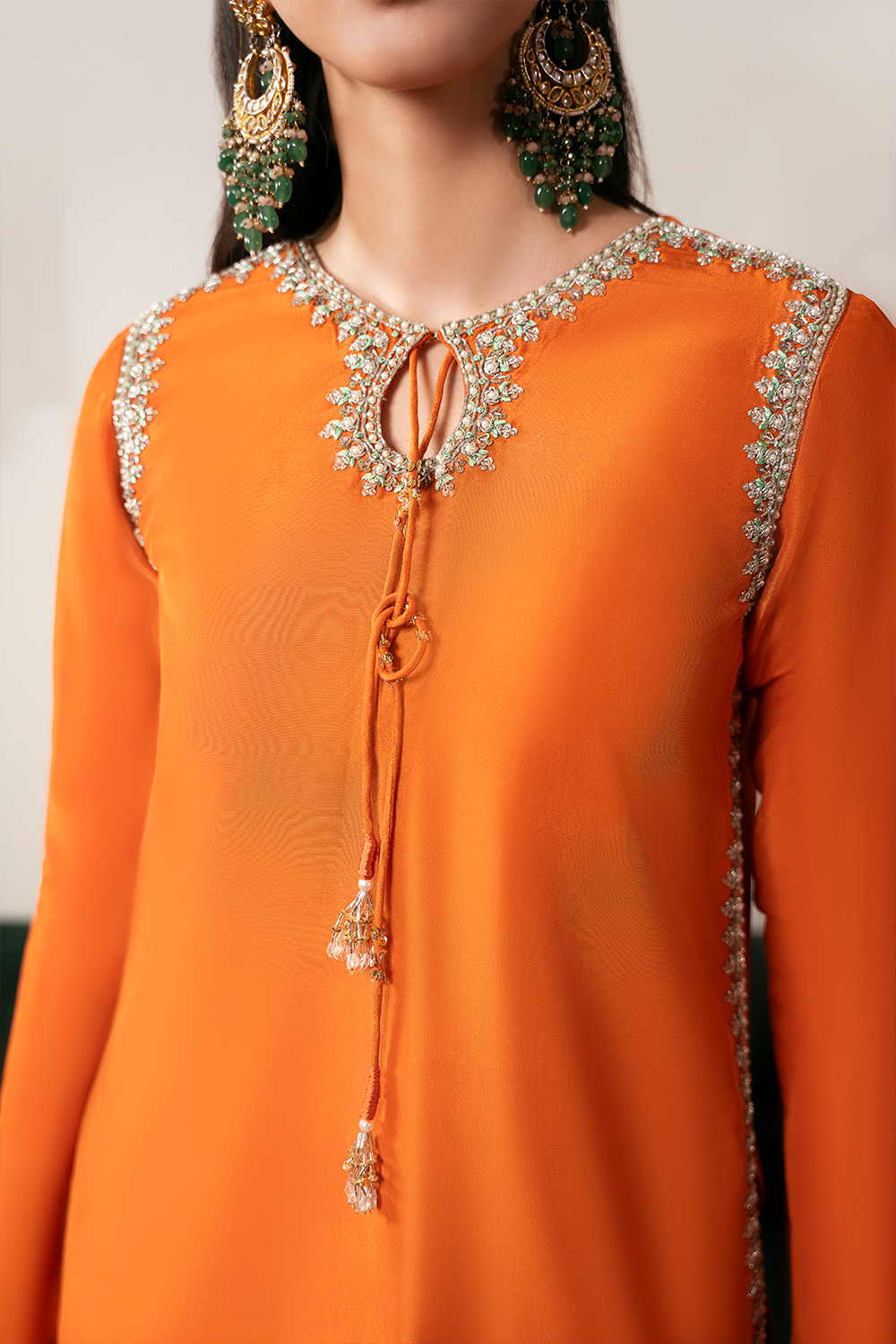 Bright, bold, and beautifully crafted — this short orange shirt is a celebration of traditional artistry. Hand-embellished with intricate Resham threadwork, shimmering sequins, naqshi, lustrous pearls, and Swarovski crystals, it radiates festive charm. The farshi shalwar features a delicate sitara spray at the bottom, adding a touch of sparkle and elegance. Paired with a soft organza dupatta, this ensemble is perfect for weddings, festive occasions, or cultural celebrations where you want to stand out.