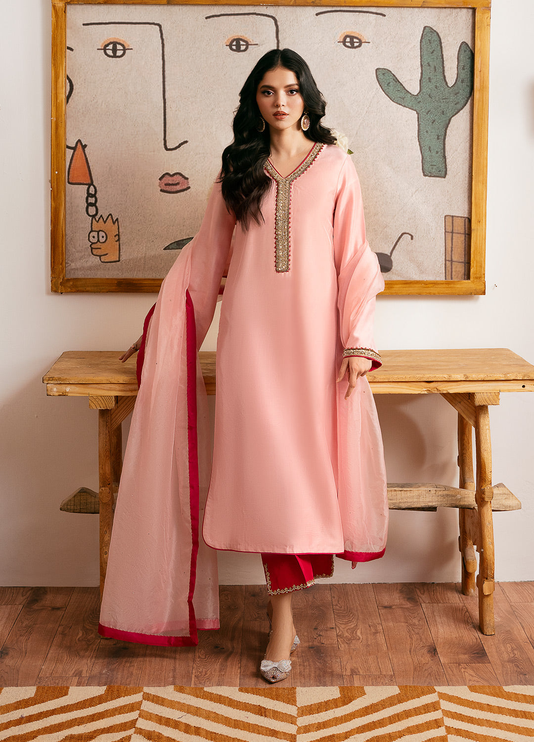 Fall in love with this enchanting combination of rose pink and light pink, designed to turn heads at every occasion. The short shirt features a hand-embellished neckline adorned with glimmering stones, Resham, sequins, and intricate naqshi detailing—an exquisite display of craftsmanship. Paired with rose pink culottes, also delicately hand-embellished, this outfit is the perfect blend of feminine charm and festive elegance.