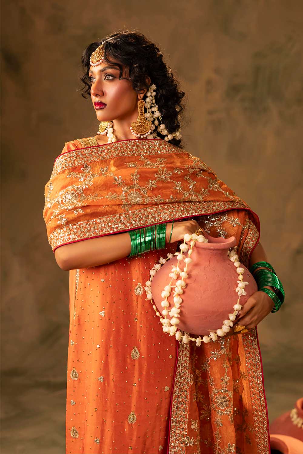 Step into timeless sophistication with Tabeer, a captivating ensemble crafted from luxurious raw silk in a rich Rust hue. This long, straight-cut shirt is a tribute to traditional artistry, featuring heavy embellishments on the neckline, sleeves, and border. Intricate handwork of Naqshi, Dabka, Mukesh, Crystals, Gota, and Sequins, adds radiant charm and depth to the design.